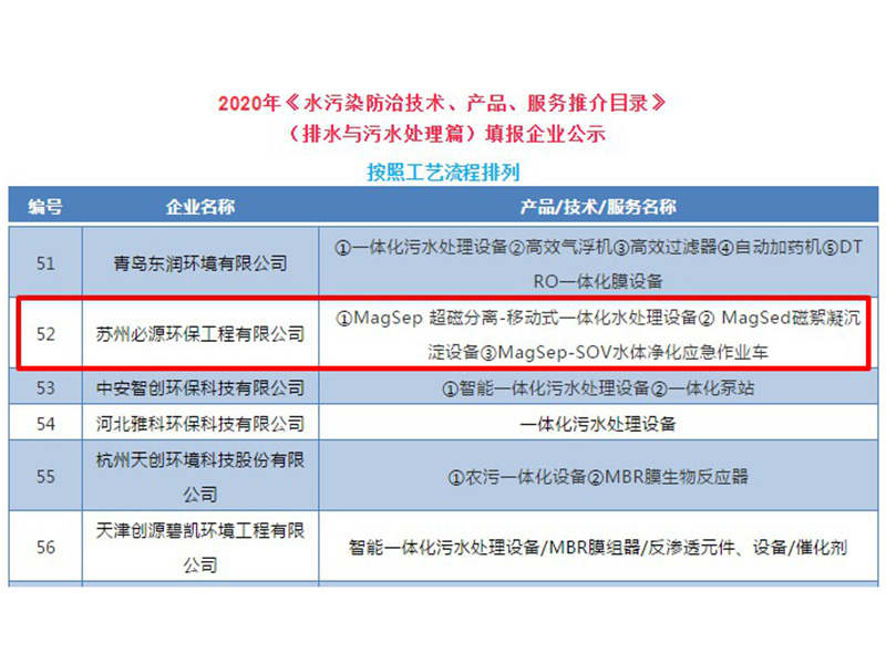 必源設備成功入選2020年《水污染防治裝備技術、產品、服務推介目錄》